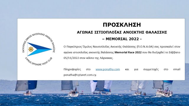 Ο Παγκύπριος Όμιλος Ναυσιπλοΐας Ανοικτής Θαλάσσης (Π.Ο.Ν.Α.ΘΑ) σας προσκαλεί στον αγώνα ιστιοπλοΐας ανοικτής θαλάσσης Memorial Race 2022 που θα διεξαχθεί το Σάββατο 05/11/2022 στον κόλπο της Λάρνακας, εις μνήμη των μελών μας Γλαύκου Κληρίδη, Σαββάκη Σαββίδη, Δημοσθένους Δήμο, Αντρέα Κλούνη και Τάκη Χατζιαντώνη.Πρόγραμμα αγώνα: